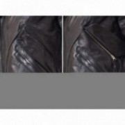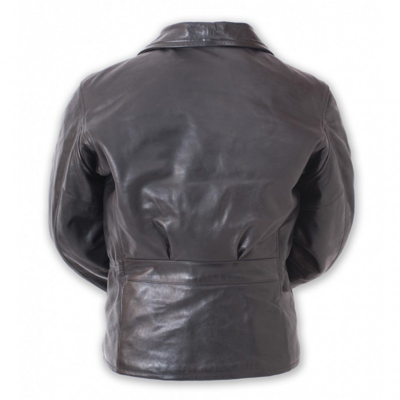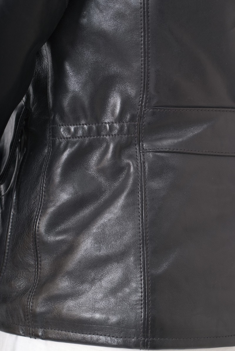 The outline pocket is piped inside with leather, not cloth cord, which in turn is sewn with an American top-stitch to hold securely. The quilted lining (which runs through body and sleeves) is 100% rayon-satin, backed with a 3mm 100% wool fill - not polyester, or other such synthetic hollow-fill - allowing it to breath, thus giving a true glowing warmth, and not a trapped hot one. The cut is reasonably close when zipped up, making it perfect for motorcyling or other open-air road pursuits - the sewn-in half belt around the back holds the garment snug into the small of your back helping to ensure the drafts don't get in.