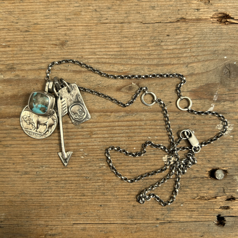- Kingman turquoise + buffalo nickel pendant, sterling arrow with sterling skull bar pendant on a 22” reworked sterling belcher chain