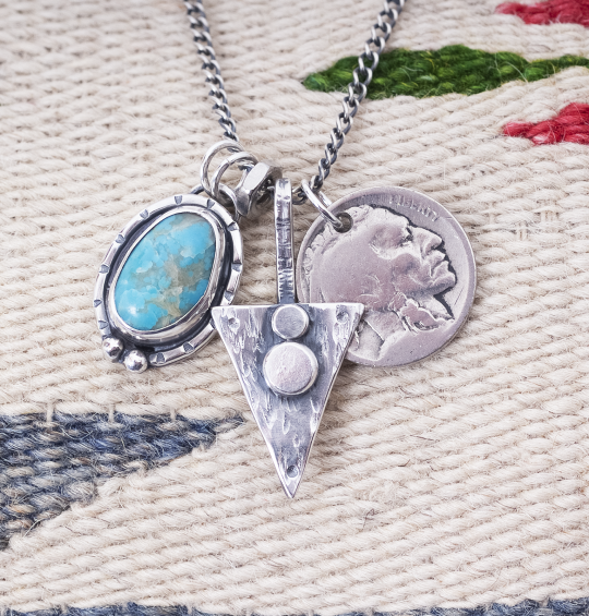 - Handmade sterling silver with Cumpas turquoise pendant on a reworked oxidised sterling silver belcher chain with hand made sterling silver link and brass link (Pendant measures 1” long including bail)
